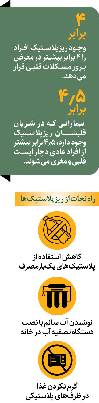 به گزارش شفاآنلاین  ریـزپلاستیـک‌هـا ذرات پلاستیکی بسیار ریزی هستند که به مرور زمان از محصولات پلاستیکی  وارد محیط‌زیست (هوا، خاک و آب) می‌شوند و از راه‌های مختلف مثل تنفس هوا، بلعیدن غذا، نوشیدن آب یا حتی تماس با پوست وارد بدن انسان می‌شوند و بعد از ورود به جریان خون می‌توانند به قلب، رگ‌ها و سایر ارگان‌ها مثل مغز (التهاب مغز یا اختلال عملکرد عصبی)، ریه‌ها، کبد، کلیه‌ها و حتی جنین برسند و آسیب ایجاد کنند. این ذرات می‌توانند باعث التهاب مزمن و اختلال عملکرد ایمنی هم شوند و به این ترتیب مقاومت بدن دربرابر عفونت‌ها و آسیب‌ها کمتر می‌شود. محققان متوجه شده‌اند که این ذرات بسیار ریز پلاستیکی بعد از ورود به بدن، در نقاط مختلف بدن ما ازجمله خون، جفت (در زنان باردار)، مغز، قلب، ریه و کبد یافت می‌شوند.